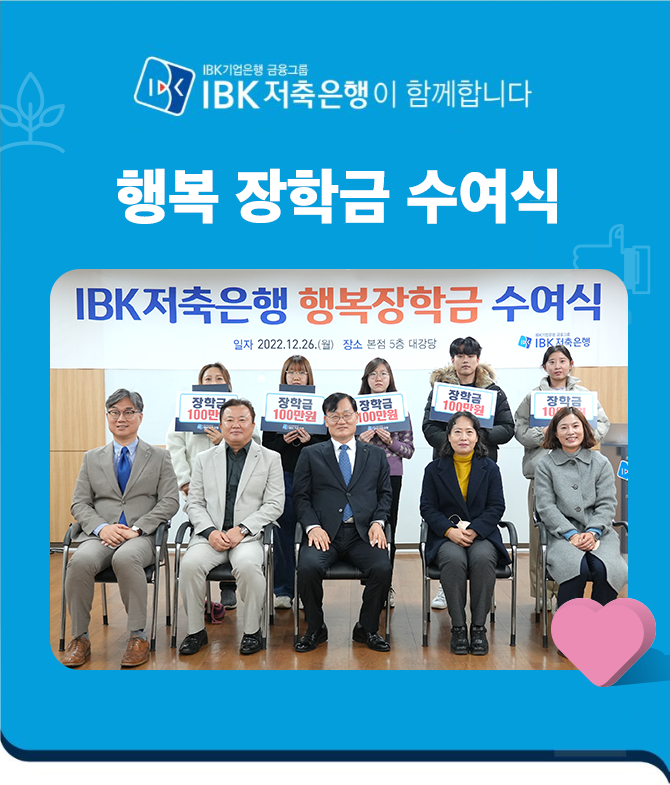 IBK저축은행 서정학 대표이사는 수여식에서"코로나19로 모두 어려운 환경이지만 학생들에게 장학금을 전달하게 돼 기쁜 마음”이라며 "국책은행의 자회사이면서 동시에 지역서민금융기관의 역할을 다하기 위해지역사회를 위한 공헌활동을 확대해 가겠다"고 밝혔다.