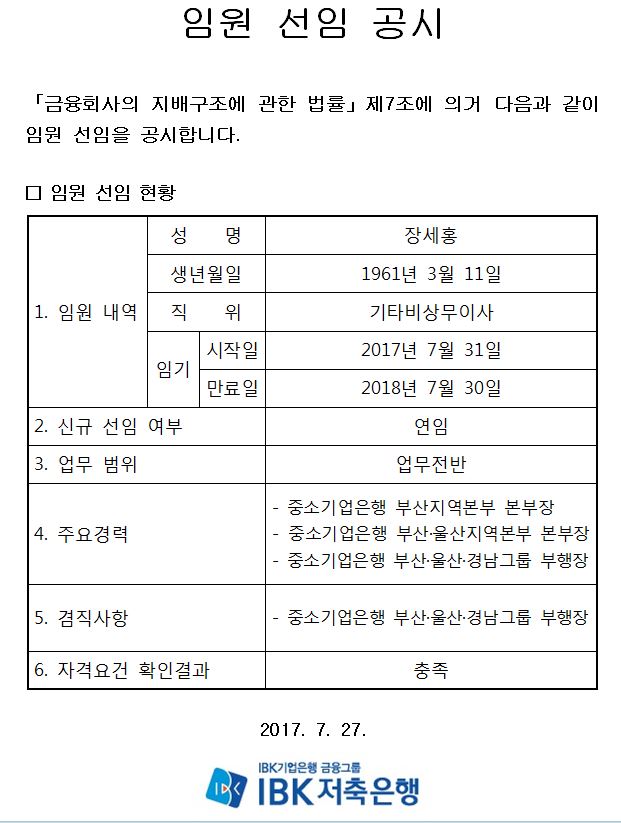 임원 선임 공시 작성자: 관리자 작성시간: 2017-07-27 14:56 조회수: 3,860 등록된 첨부파일이 없습니다. 이전글 제7기 제2차 임시주주총회 결과 공시자료 다음글 임원 선임 공시 목록