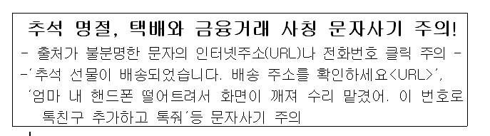 추석 명절, 택배와 금융거래 사칭 문자사기 주의!