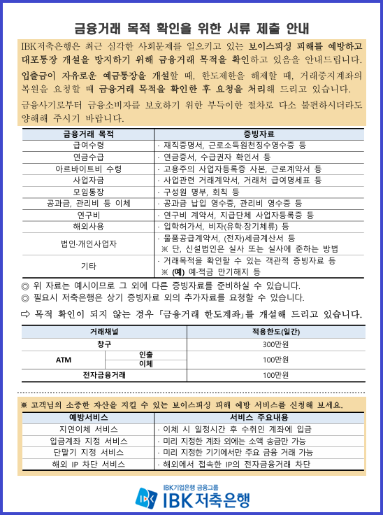 IBK저축은행은 최근 심각한 사회문제를 일으키고 있는 보이스피싱 피해를 예방하고 대포통장 개설을 방지하기 위해 금융거래 목적을 확인하고 있음을 안내드립니다.