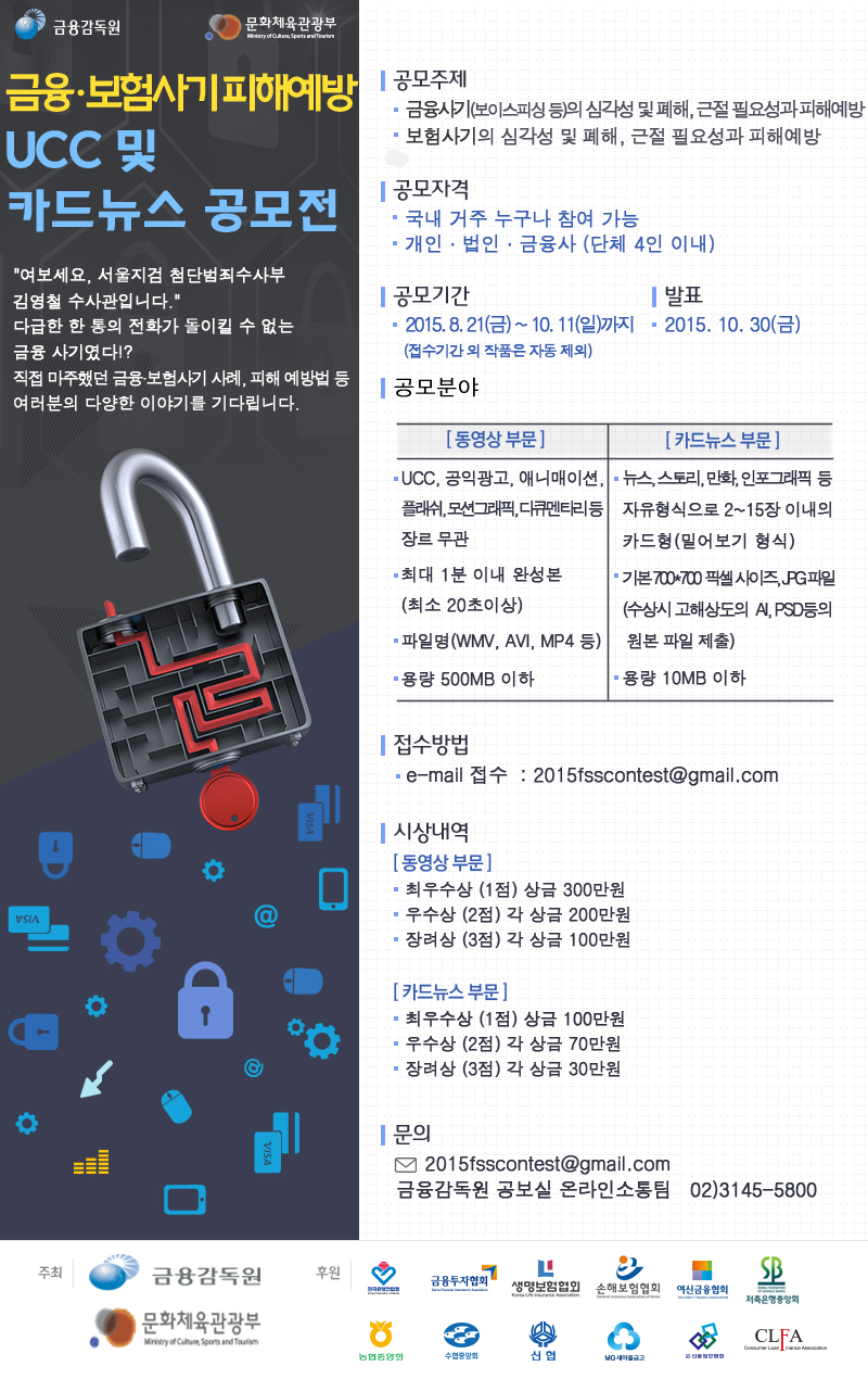 [2015 금융 보험사기 피해예방 ucc 카드뉴스 공모전]을 2015.8.21(금)~10.11(일)까지 진행합니다.