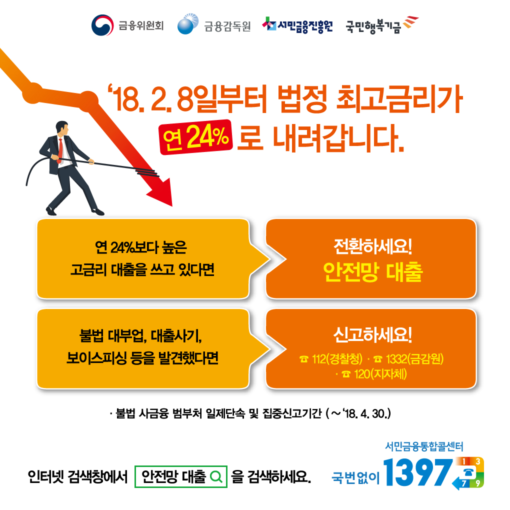 정부의 '대부업법 시행령' 개정을 통해 '18.2.8일부터 법정 최고금리가 24.0%로 인하될 예정입니다.