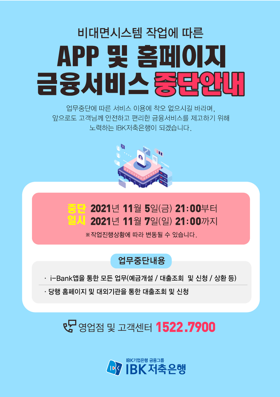 비대면시스템 작업에 따른 모바일App 및 홈페이지 금융서비스 중단안내 작성자: 관리자 작성시간: 2021-10-18 15:23 조회수: 3,673 등록된 첨부파일이 없습니다. 이전글 IBK저축은행 영업시간 단축 관련 고객 안내문 다음글 IBK저축은행 회계법인 선정 입찰 공고 목록