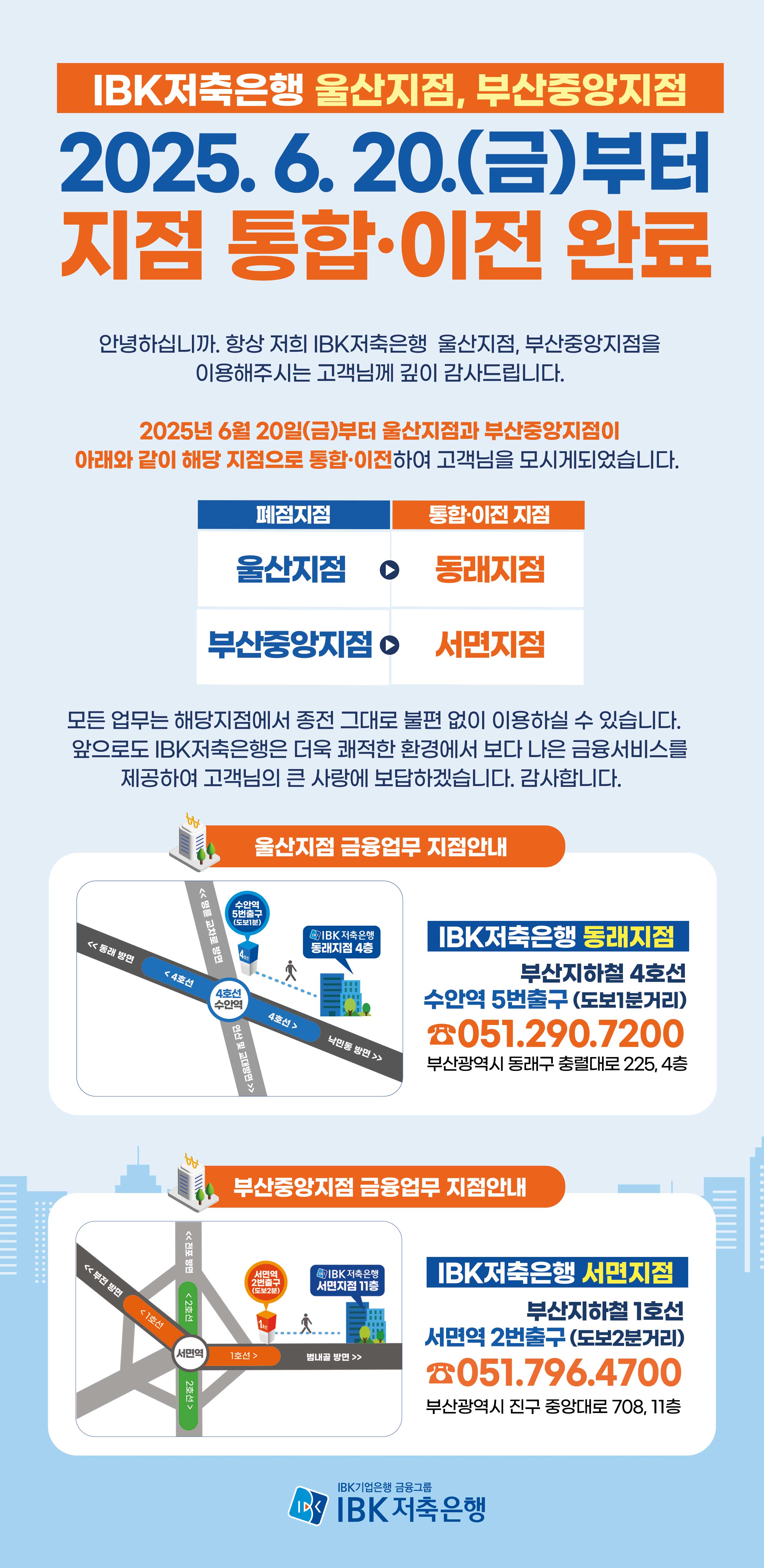 2025.6.20.(금) 울산, 부산중앙지점 통합·이전 완료안내 작성자: 관리자 작성시간: 2025-06-19 10:34 조회수: 2,532 등록된 첨부파일이 없습니다. 이전글 2025.6.19.(목) 울산, 부산중앙지점 통합·이전안내 다음글 입찰공고문(IBK저축은행 책무구조도 컨설팅업체 선정) 목록