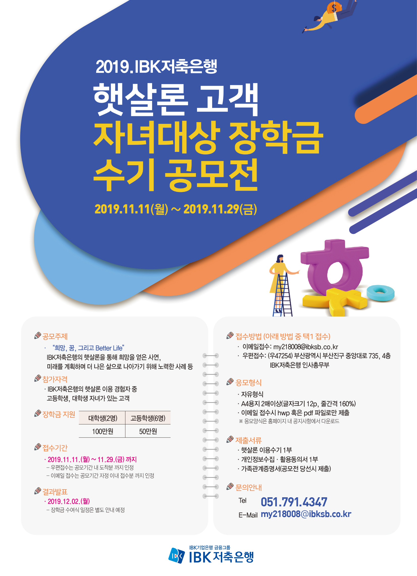 햇살론 고객 자녀대상 장학금 수기 공모전 안내 작성자: 관리자 작성시간: 2019-11-11 17:22 조회수: 2,670 (첨부)햇살론 이용 수기 공모 양식.hwp (22 K) [1159] 이전글 IBK저축은행 우량 중소기업 대출 안내 다음글 특판 정기적금(2020 힘찬 정기적금) 출시 안내 목록