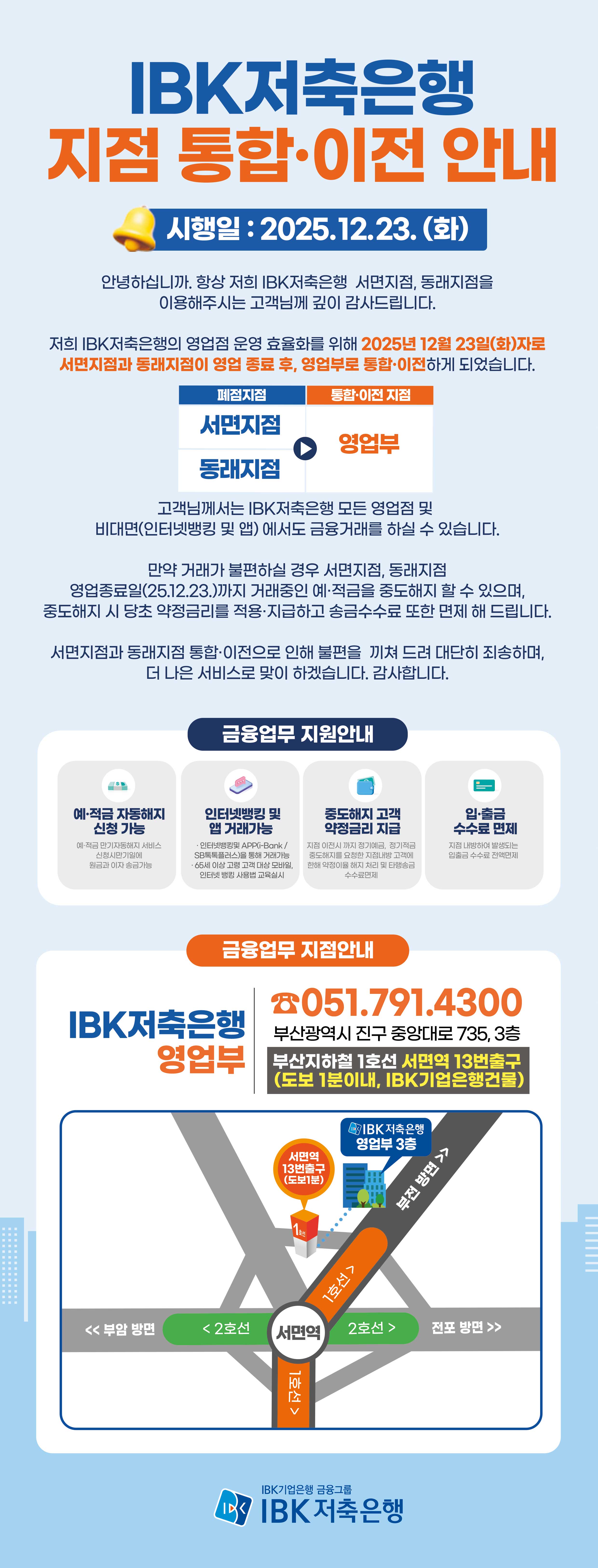 2025.12.23.(화) IBK저축은행 동래지점, 서면지점 통합·이전 안내 작성자: 관리자 작성시간: 2025-10-23 17:31 조회수: 1,951 등록된 첨부파일이 없습니다. 이전글 주민등록증 진위확인 장애 관련 안내 다음글 [고객이벤트 안내] 둘만 모여도 모임완성! 모임통장 오픈이벤트 목록