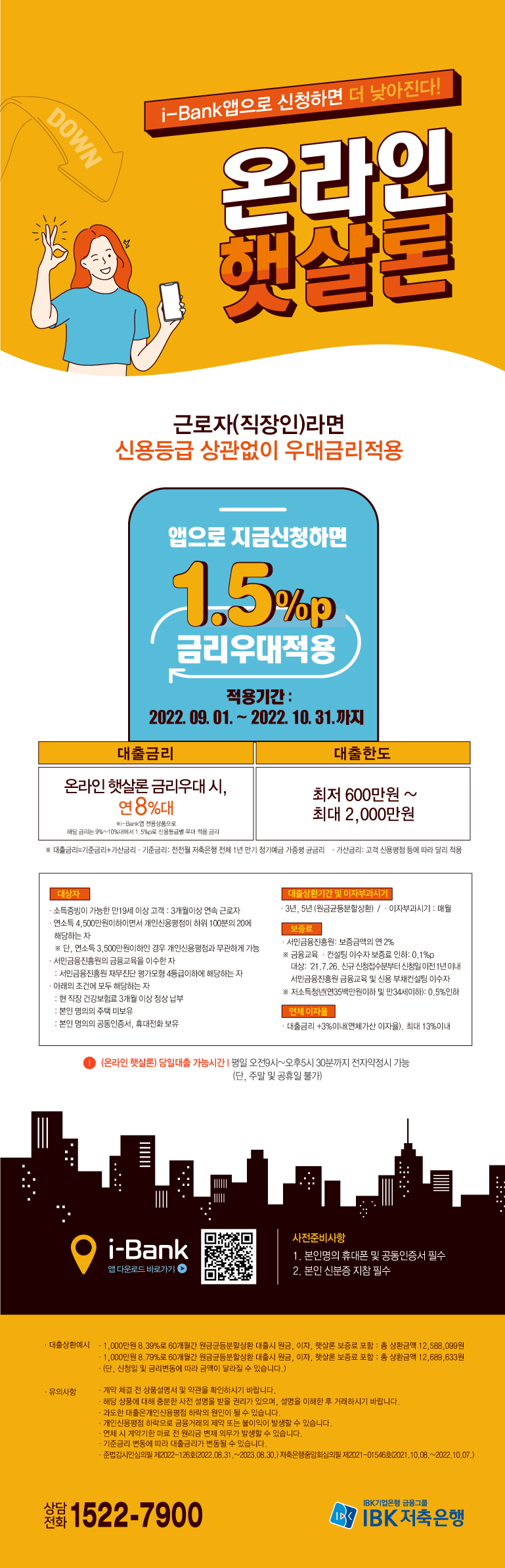 온라인햇살론, i-Bank앱으로 신청하면 더 낮아집니다! 작성자: 관리자 작성시간: 2021-10-13 09:58 조회수: 4,258 i-Bank앱다운로드 바로가기: www.ibksb.co.kr/app_v2_download 등록된 첨부파일이 없습니다. 이전글 i-Bank APP 일시 사용중지 안내 다음글 2021년 하반기 경력직(IT부문 외) 채용공고 목록