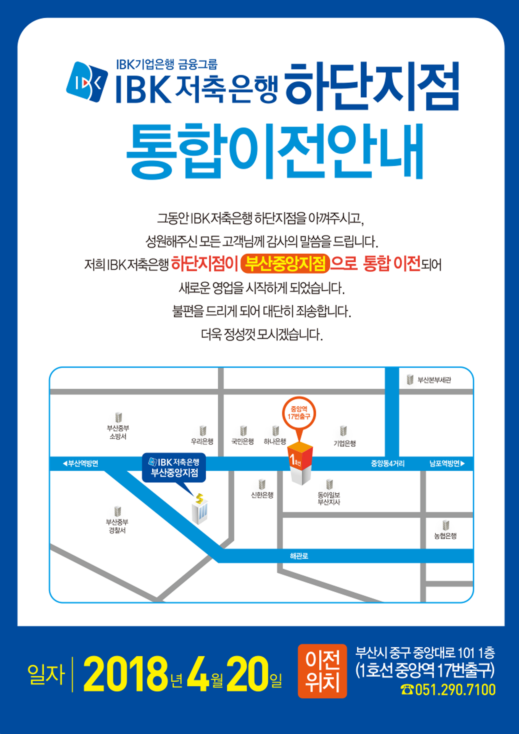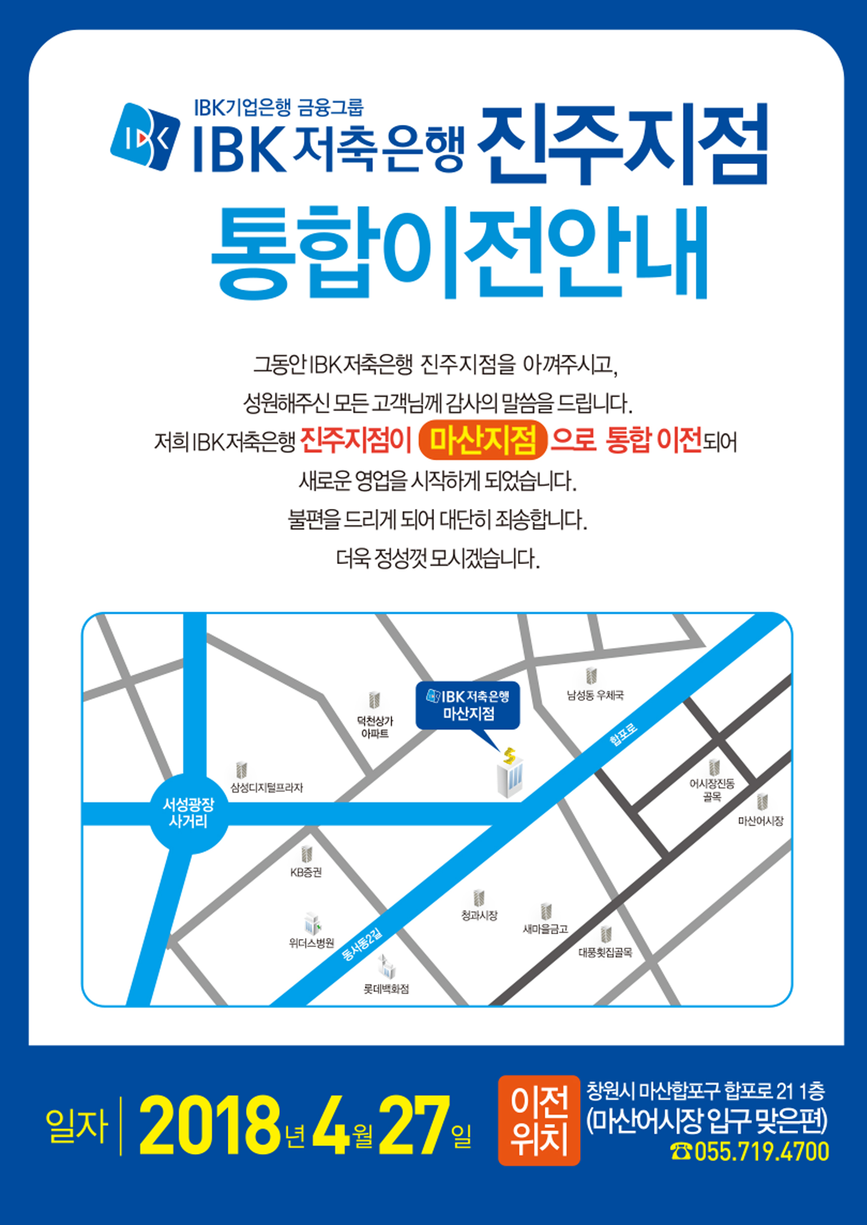 하단지점 · 진주지점 통합이전안내 작성자: 관리자 작성시간: 2018-03-26 09:41 조회수: 3,205 등록된 첨부파일이 없습니다. 이전글 [2018.03.07] 정기예금 금리 변경 다음글 IBK저축은행 영업부 확장오픈 안내 목록