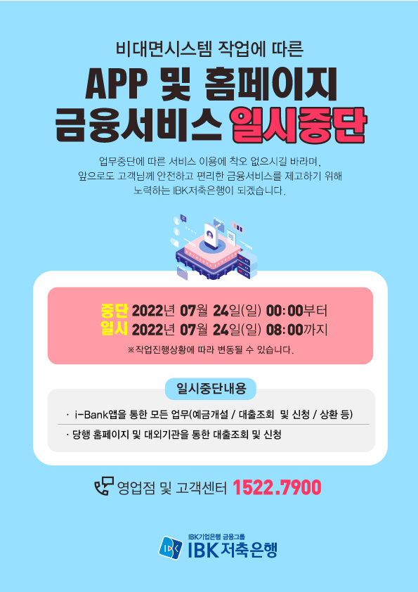 업무중단에 따른 서비스 이용에 착오 없으시길 바라며, 앞으로도 고객님께 안전하고 편리한 금융서비스를 제공하기 위해 노력하는 IBK저축은행이 되겠습니다.