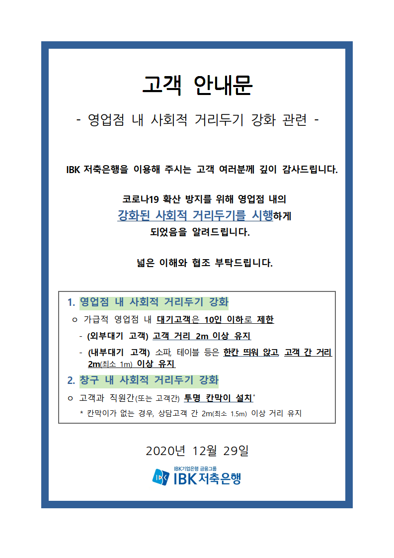 영업점 내 사회적 거리두기 강화 관련 고객 안내문 작성자: 관리자 작성시간: 2020-12-29 09:01 조회수: 3,040 (첨부) 영업점 내 사회적 거리두기 강화 관련 고객 안내문.pdf (67 K) [1209] 이전글 영업시간 단축 연장관련 고객 안내문 다음글 신용대출거래 일시중단 안내 목록