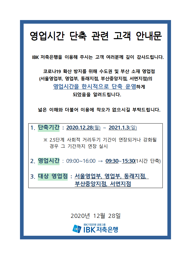 영업시간 단축 연장관련 고객 안내문 작성자: 관리자 작성시간: 2020-12-29 09:00 조회수: 3,114 (첨부) 영업시간 단축 연장 관련 고객 안내문.pdf (63 K) [1106] 이전글 공인인증서 명칭변경 안내 다음글 영업점 내 사회적 거리두기 강화 관련 고객 안내문 목록