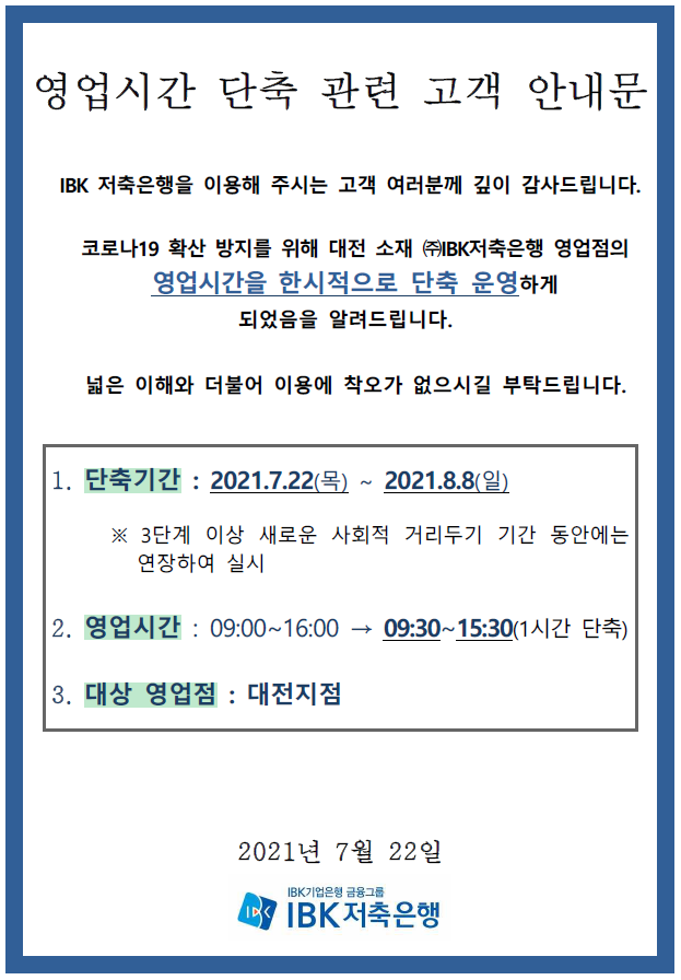 IBK저축은행 대전지점 영업시간 단축 연장 관련 고객 안내문 작성자: 관리자 작성시간: 2021-07-28 16:20 조회수: 2,131 IBK저축은행 대전지점 영업시간 단축관련 고객 안내문.pdf (60 K) [956] 이전글 IBK저축은행 부산소재 영업점 영업시간 단축 관련 고객 안내문 다음글 IBK저축은행 영업시간 단축관련 고객 안내문 목록
