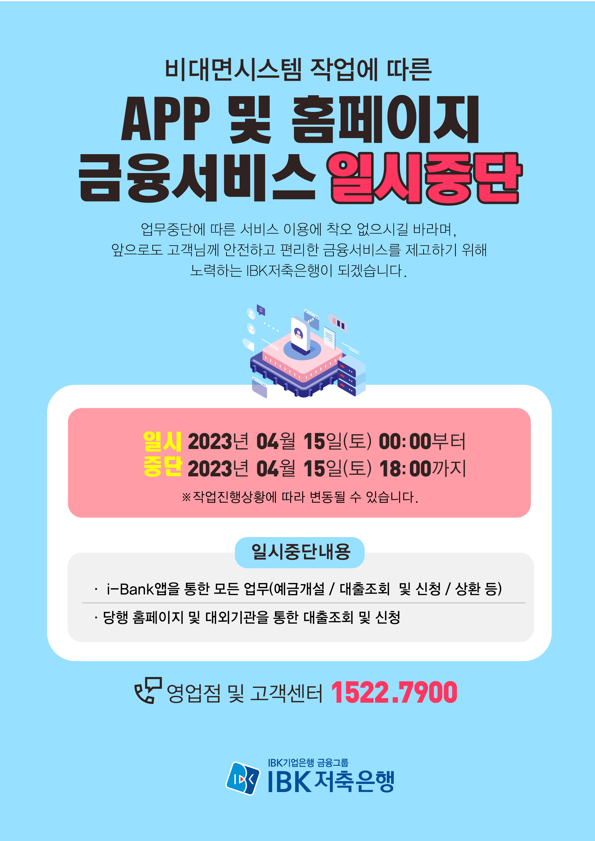 뱅킹서비스 일시중단 안내 작성자: 관리자 작성시간: 2023-04-13 13:17 조회수: 3,588 등록된 첨부파일이 없습니다. 이전글 ㈜IBK저축은행 법인세 세무조정용역 입찰 공고 다음글 IBK저축은행 채권 회수업무 위임 업체 선정을 위한 입찰 참가 및 제안서 제출 안내 공고문 목록
