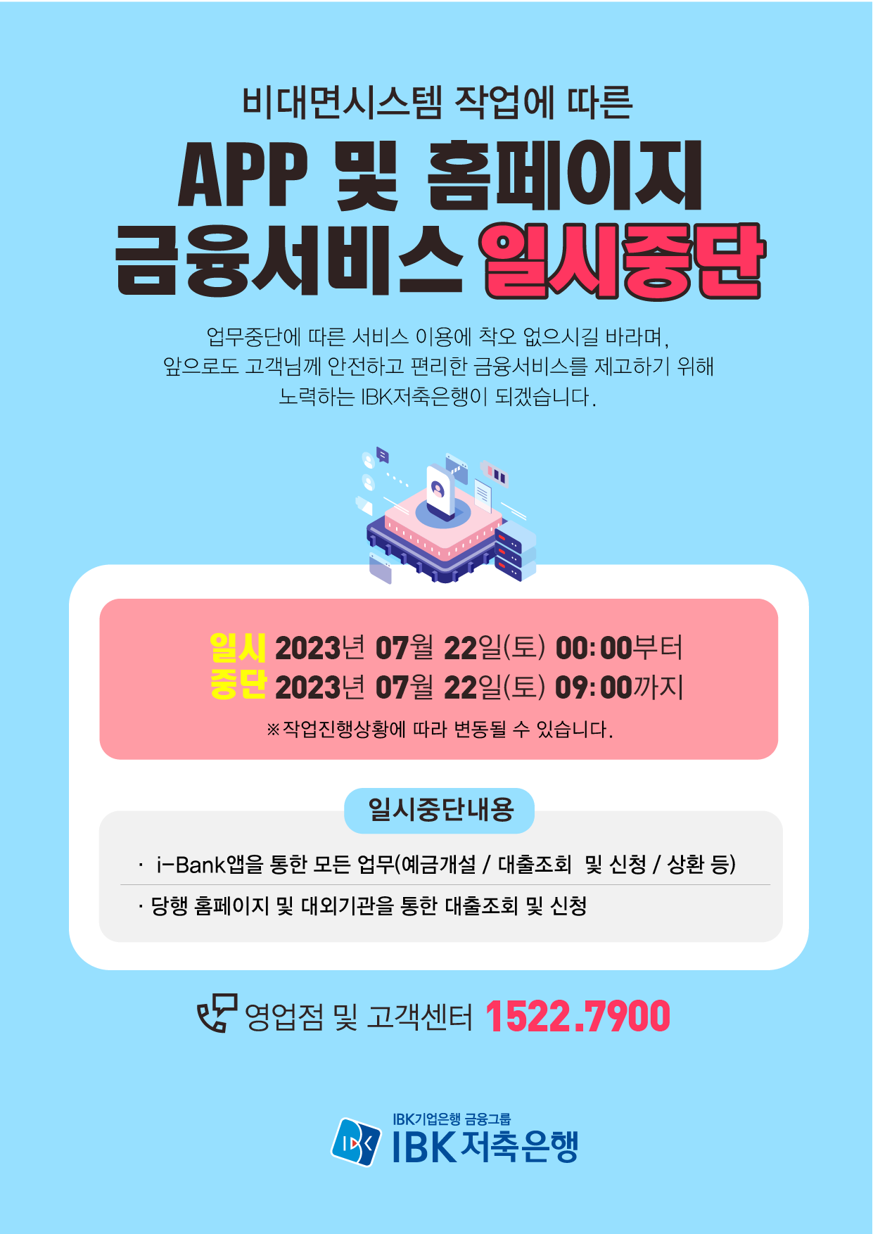 뱅킹서비스 일시중단 안내 작성자: 관리자 작성시간: 2023-07-21 10:25 조회수: 3,851 등록된 첨부파일이 없습니다. 이전글 「금융소비자보호기준 」 개정에 따른 안내 다음글 IBK저축은행 채권매각공고 목록