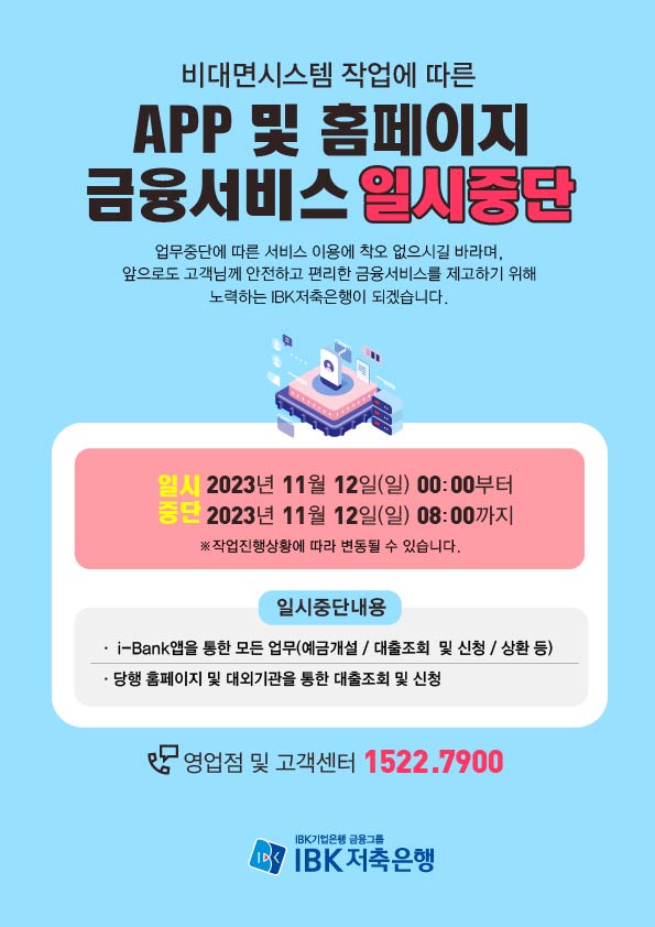 뱅킹서비스 일시중단 안내 작성자: 관리자 작성시간: 2023-11-09 14:29 조회수: 3,513 등록된 첨부파일이 없습니다. 이전글 ㈜IBK저축은행 ‘23년 신입행원(채용형 인턴) 채용 공고 다음글 전금융권 숨은금융자산 찾기 캠페인 목록