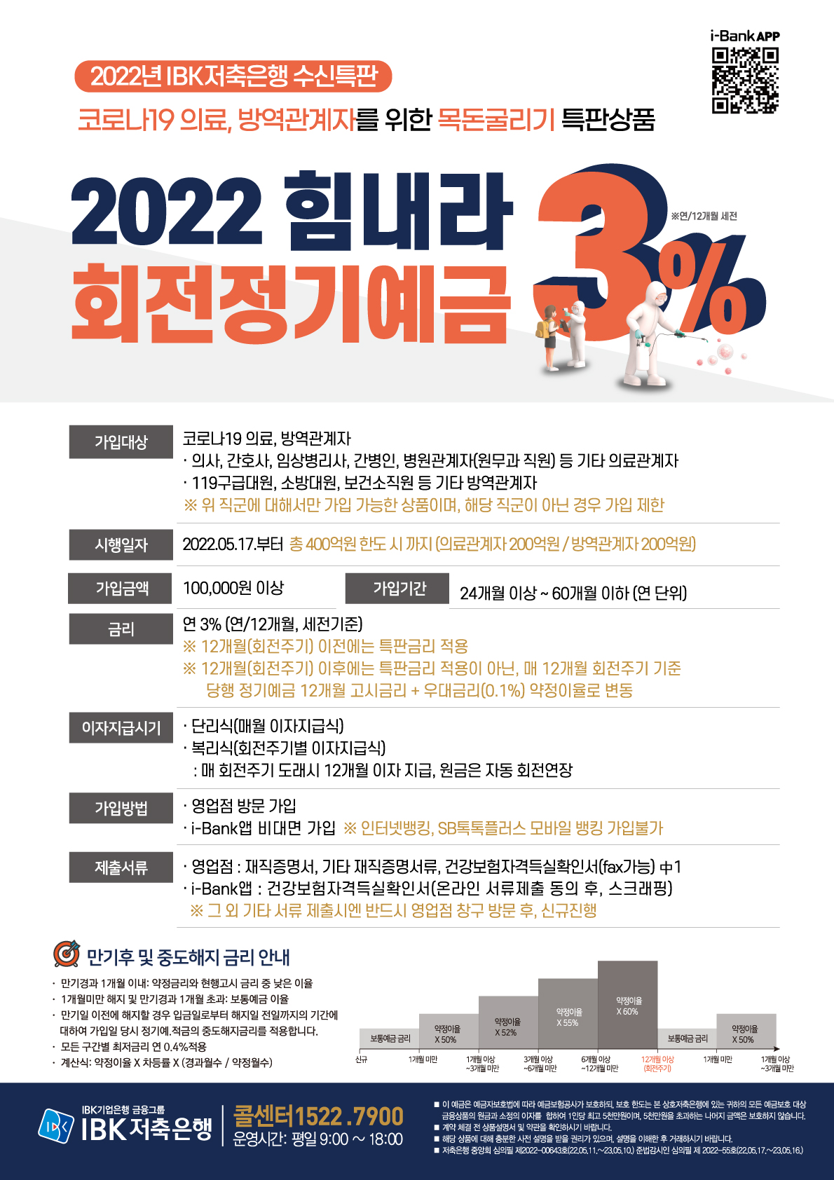 코로나19의료, 방역관계자를 위한 목돈굴리기 특판상품 - 2022 힘내라 회전정기예금 3%