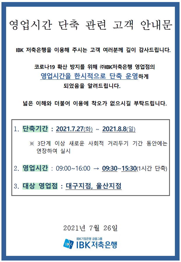 IBK저축은행 영업시간 단축관련 고객 안내문 작성자: 관리자 작성시간: 2021-07-28 16:25 조회수: 2,048 IBK저축은행 영업시간 단축관련 고객 안내문.pdf (61 K) [929] 이전글 IBK저축은행 대전지점 영업시간 단축 연장 관련 고객 안내문 다음글 IBK저축은행 영업시간 단축 관련 고객 안내문 목록