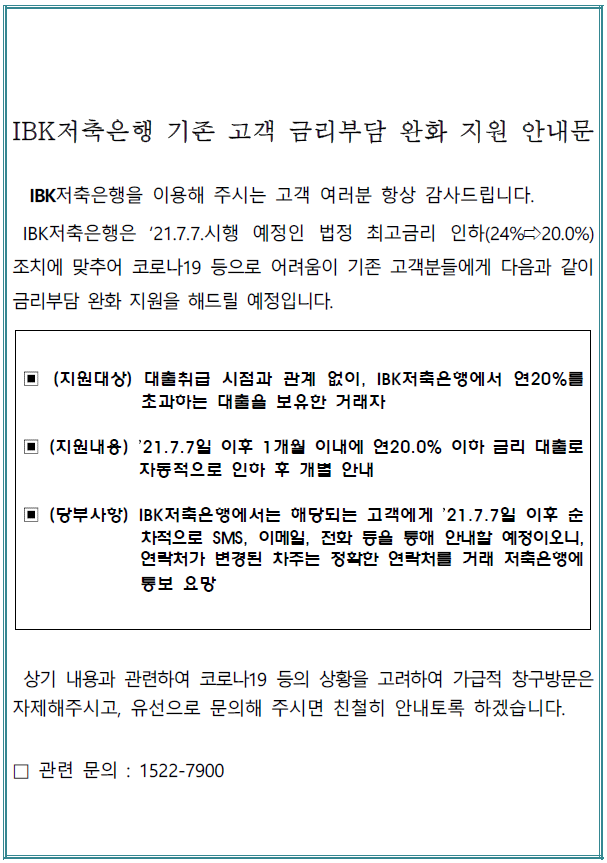IBK저축은행 기존 고객 금리부담 완화 지원 안내문 작성자: 관리자 작성시간: 2021-07-06 14:23 조회수: 2,293 IBK저축은행 대고객 안내문.pdf (86 K) [1039] 이전글 (주)IBK저축은행 경력직(회계/결산) 및 전문계약직(여신심사) 채용(연장) 공고 다음글 [7월이벤트] IBK저축은행 대출간편한도조회 이벤트_배달의민족 1만원 쿠폰증정 목록
