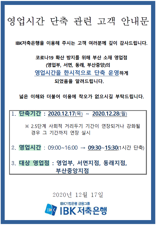 영업시간 단축 관련 고객 안내문 작성자: 관리자 작성시간: 2020-12-16 16:59 조회수: 3,296 영업시간 단축 관련 고객 안내문.pdf (61 K) [1122] 이전글 2021년 신입행원 필기전형 일정 연기 안내 다음글 i-Bank App 일시 사용 중지 안내[완료] 목록
