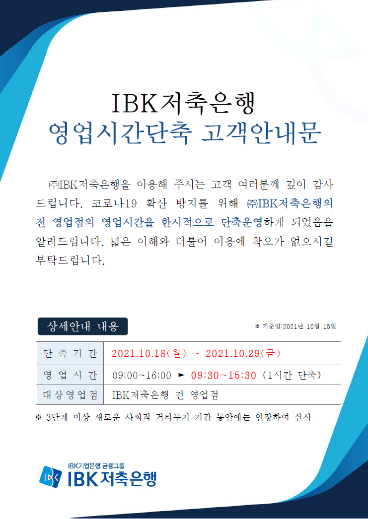IBK저축은행 영업시간 단축 관련 고객 안내문 작성자: 관리자 작성시간: 2021-10-15 18:12 조회수: 3,268 IBK저축은행 영업시간 단축(전지점) 안내문_10월15일 기준.pdf (154 K) [1042] 이전글 2021년 하반기 신입행원 채용공고 다음글 비대면시스템 작업에 따른 모바일App 및 홈페이지 금융서비스 중단안내 목록