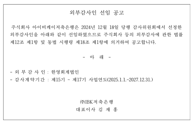 주식회사 아이비케이저축은행은 2024년 12월 18일 당행 감사위원회에서 선정한 외부감사인을 아래와 같이 선임하였으므로 주식회사 등의 외부감사에 관한 법률 제12조 제1항 및 동법 시행령 18조 제1항에 의거하여 공고합니다.