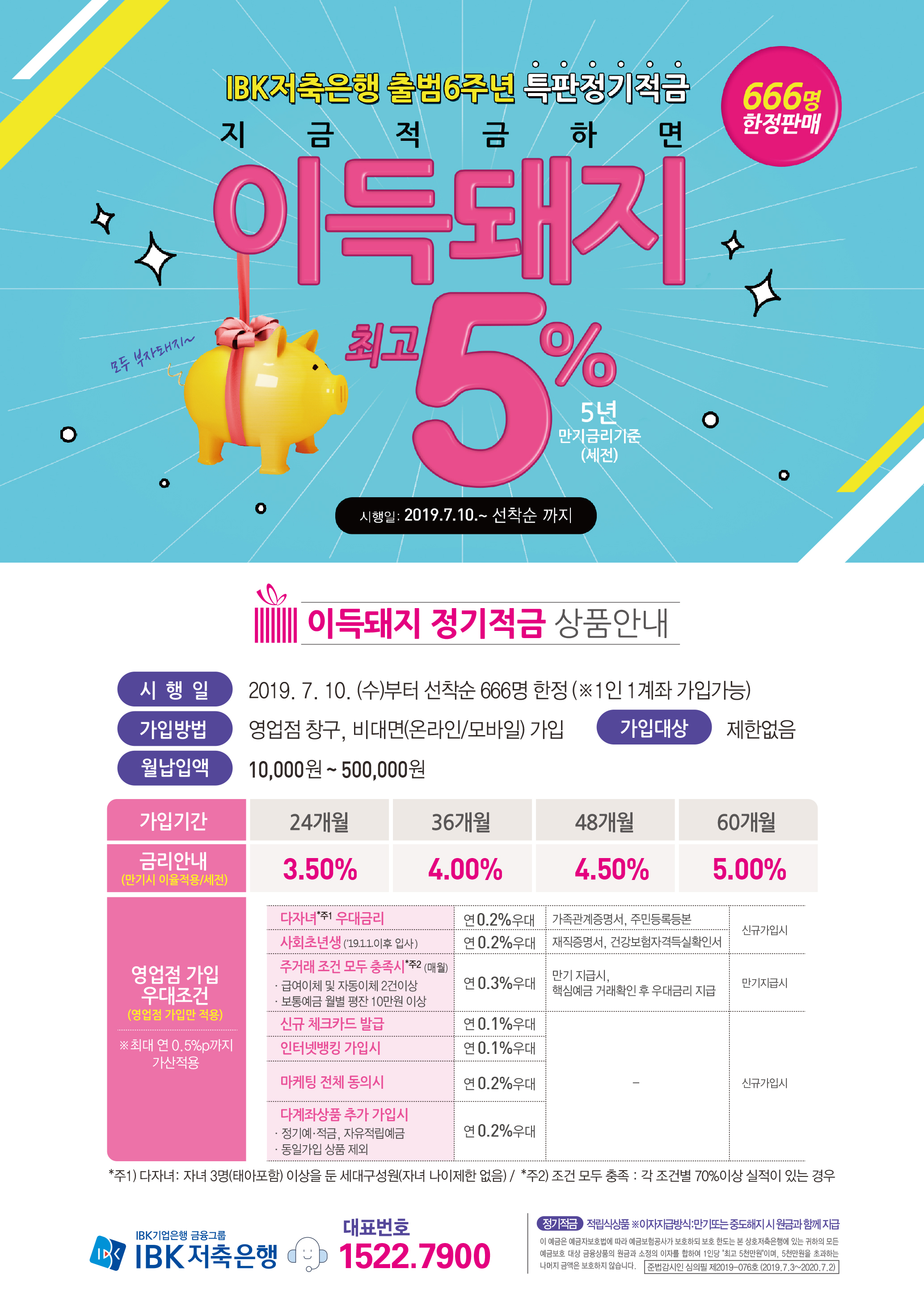 [IBK저축은행]출범 6주년 기념 특판정기적금 출시 안내 작성자: 관리자 작성시간: 2019-07-09 19:04 조회수: 3,532 등록된 첨부파일이 없습니다. 이전글 IBK 저축은행 소개 동영상 다음글 출범 6주년 기념 특판상품[이득돼지 정기적금] 판매종료 안내 목록