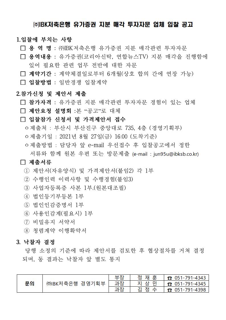 ㈜IBK저축은행 유가증권 지분 매각관련 투자자문 업체 입찰 공고 작성자: 관리자 작성시간: 2021-08-17 11:56 조회수: 2,219 입찰제안요청서(양식)_20210817_00.hwp (26 K) [978] 이전글 IBK저축은행 영업시간 단축 관련 고객 안내문 다음글 ㈜IBK저축은행 IFRS9 회계정책서 고도화 위한 외부평가기관(회계법인) 입찰 공고 목록