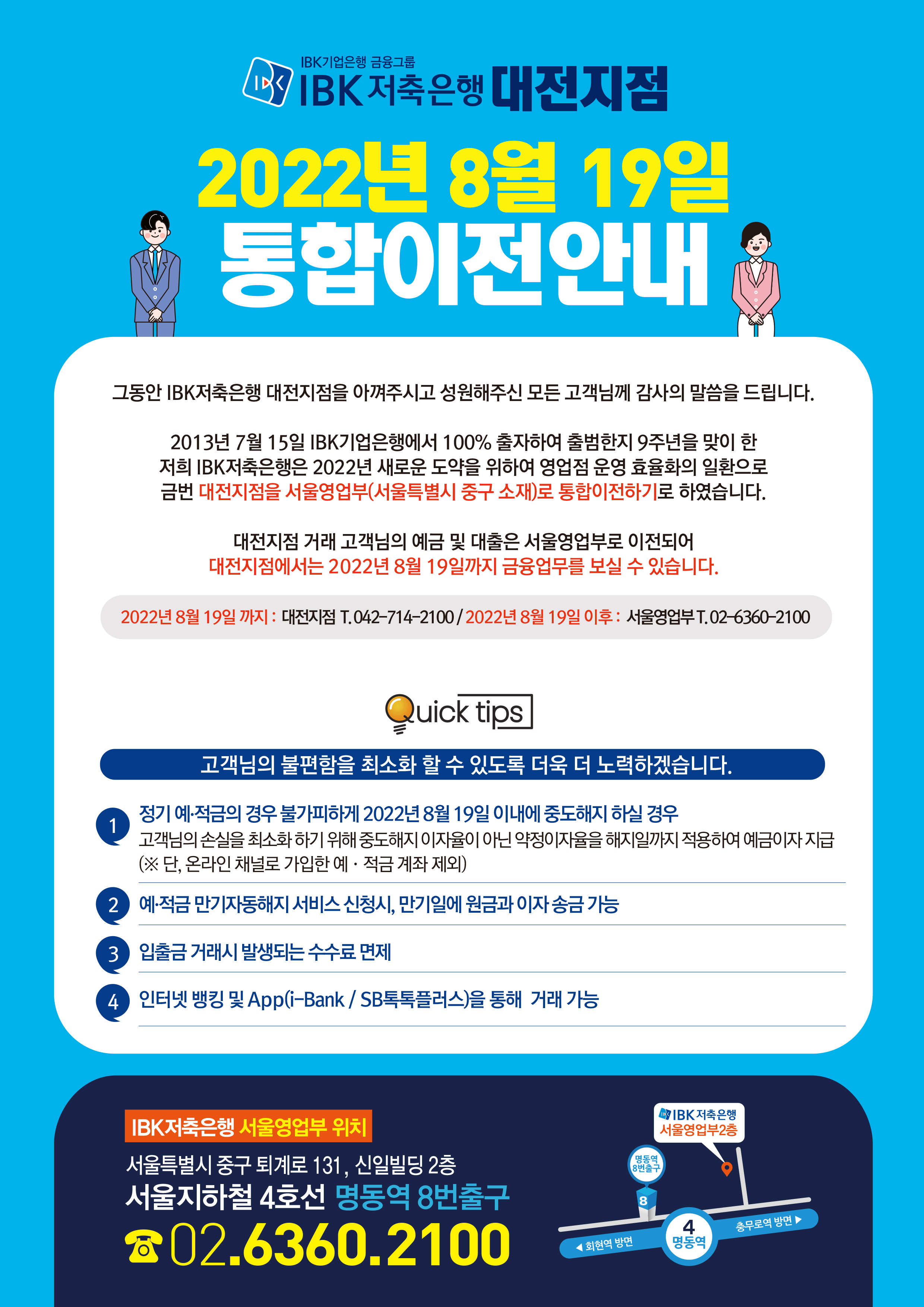 IBK저축은행 대전지점 2022년 8월 19일 통합이전안내