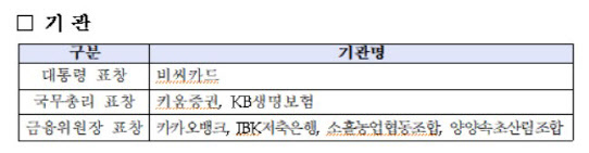카카오뱅크, IBK저축은행, 소흘농업협동조합, 양양속초산림조합 등 4곳과 금융감독원 직원 등 개인 26명은 금융위원장 표창을 받았다. 금융위는 "비씨카드는 의심거래 모니터링 및 운영 체계를 고도화하고, 자금세탁 위험평가 관리체계 도입, 고객 확인 정보의 통합 관리 플랫폼 개발 등 자금세탁방지 관련 투자를 확대했다"고 설명했다.