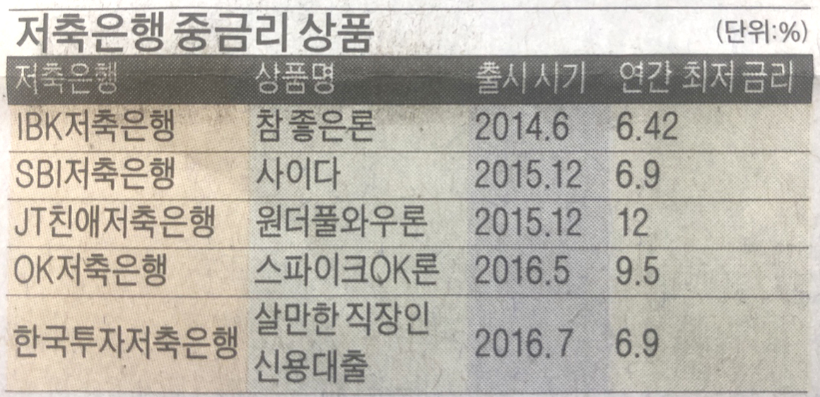 이외에도 웰컴저축은행은 '텐텐대출'(연간 대출금리 8.9~19.9%), KB저축은행의 'KB착한대출'(연간 대출금리 6.5~19.9%) 등이 대표적인 저축은행 중금리 대출상품으로 꼽힌다. 오는 9월에는 저축은행과 서울보증보헌 간 협약 아래 연간대출금리 10% 안팎의 중금리 상품을 출시할 예정이다.