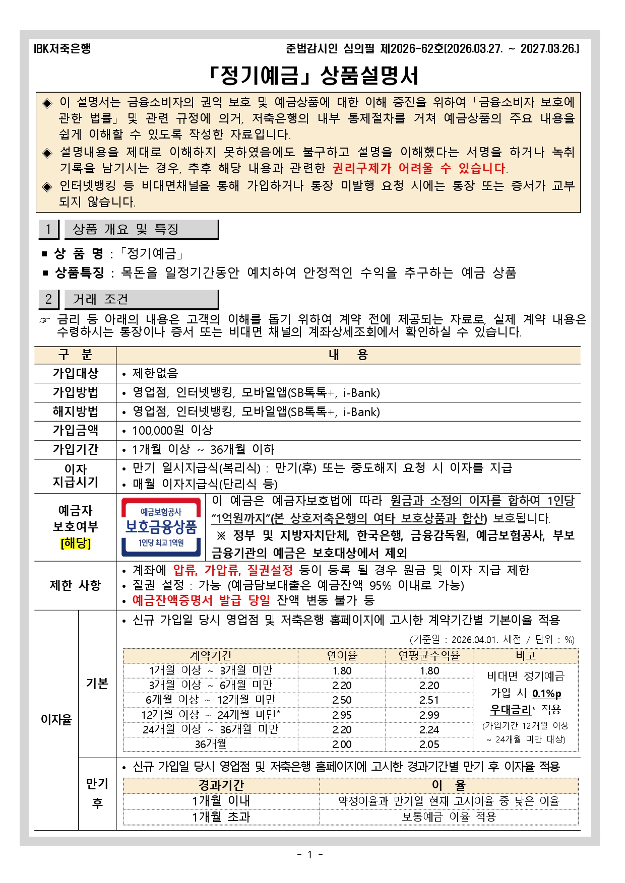 정기예금 상품설명서 작성자: 관리자 작성시간: 2019-07-02 10:21 조회수: 11,240 정기예금 상품설명서_20260401시행.pdf (335 K) [7] 다음글 정기적금 상품설명서 목록