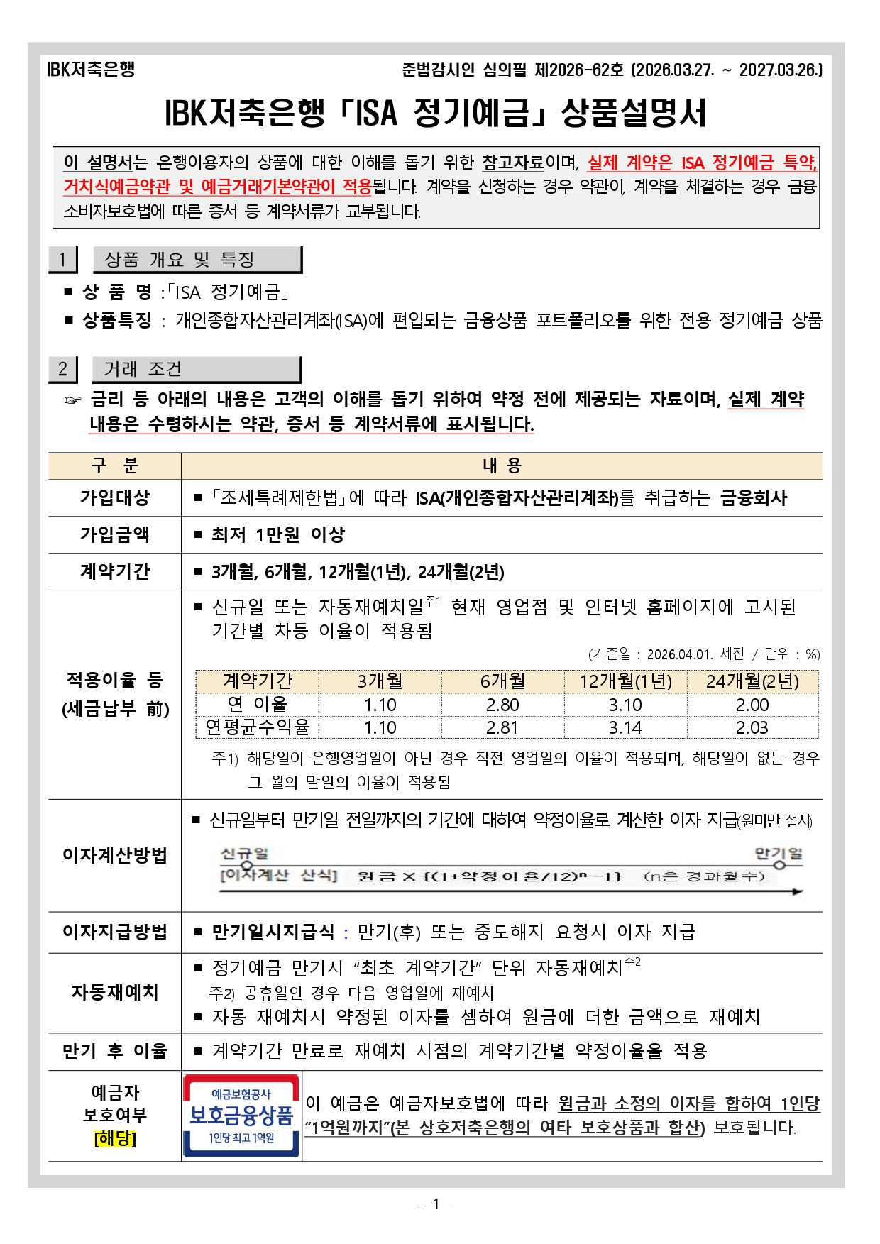 ISA정기예금 상품설명서 작성자: 관리자 작성시간: 2019-07-02 16:49 조회수: 8,850 ISA정기예금 상품설명서_20260401시행.pdf (265 K) [6] 이전글 퇴직연금정기예금 상품설명서 다음글 보통예금 상품설명서 목록