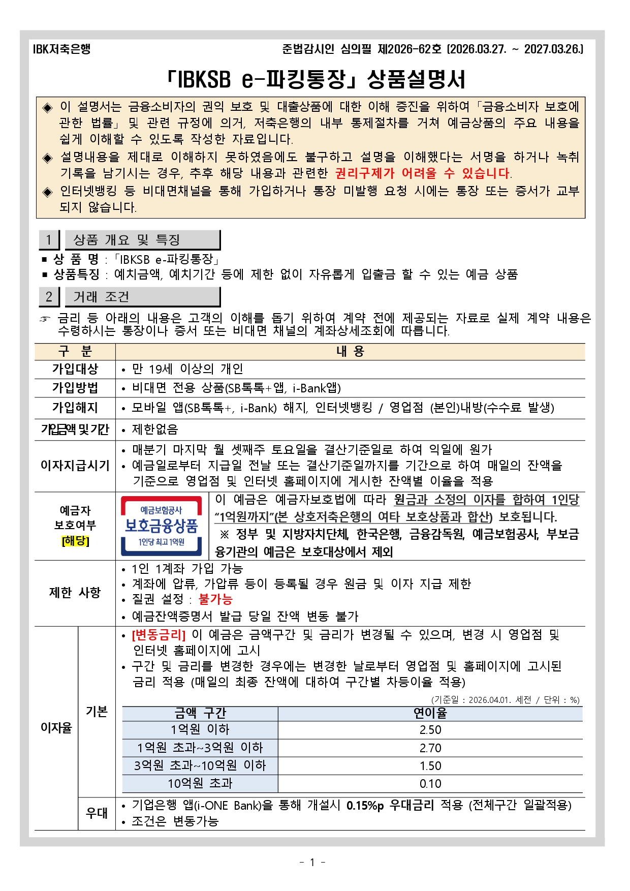 IBKSB e-파킹통장 상품설명서 작성자: 관리자 작성시간: 2021-05-31 22:34 조회수: 8,975 IBKSB e-파킹통장 상품설명서_20260401시행.pdf (147 K) [3] 이전글 (판매중단) 기업자유예금 상품설명서 다음글 IBKSB 회전정기예금(변동금리) 상품설명서 목록